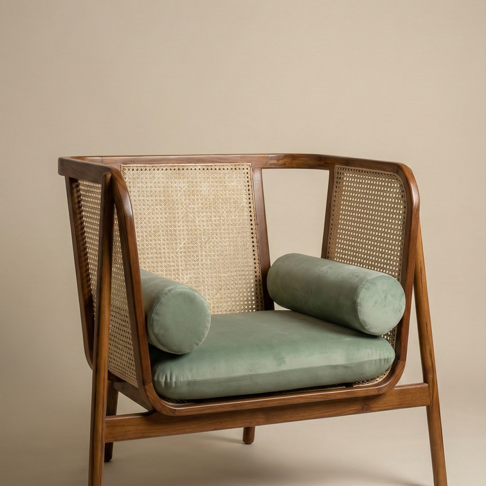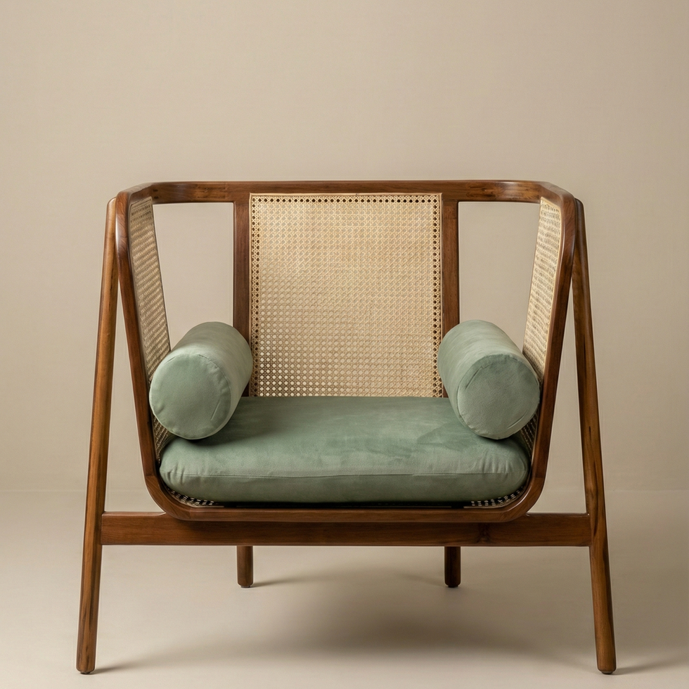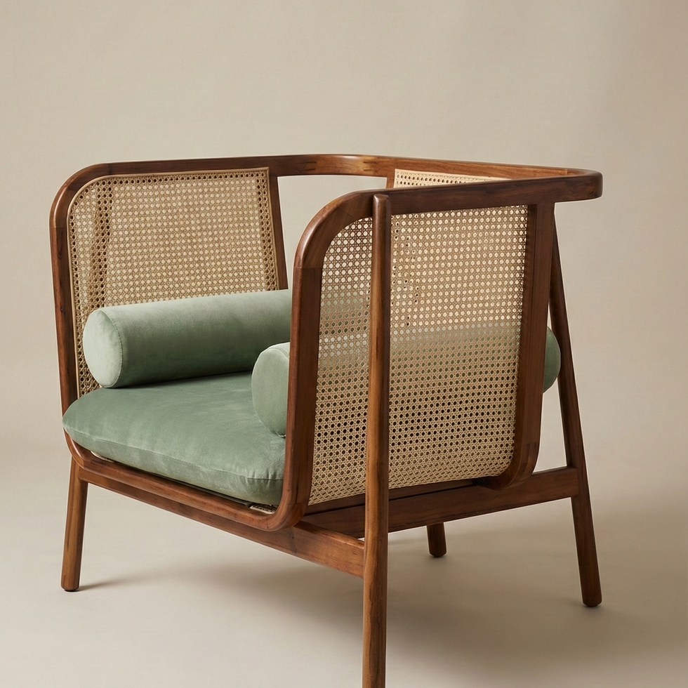 Lounge chair in reclaimed Burma teak with Assam cane seating and loose cushions.