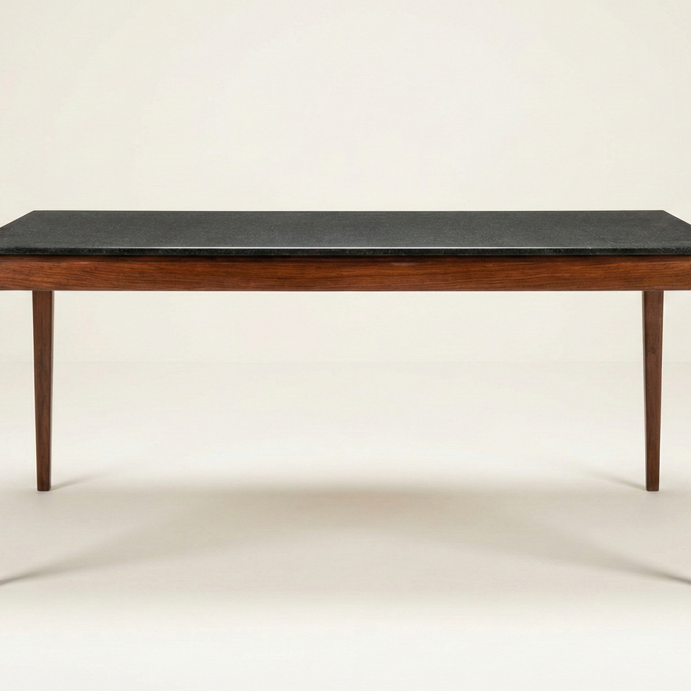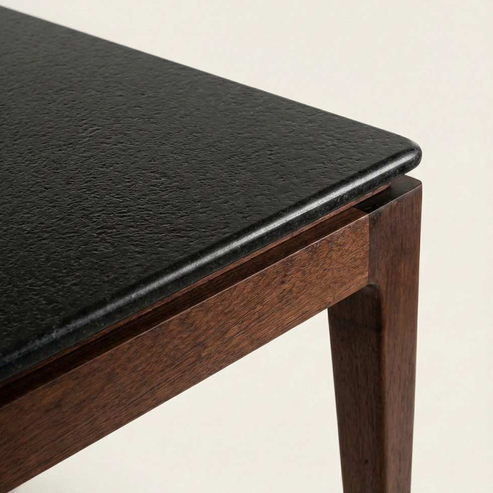 Dining table with base in reclaimed Burma teak with leather finish granite top.
